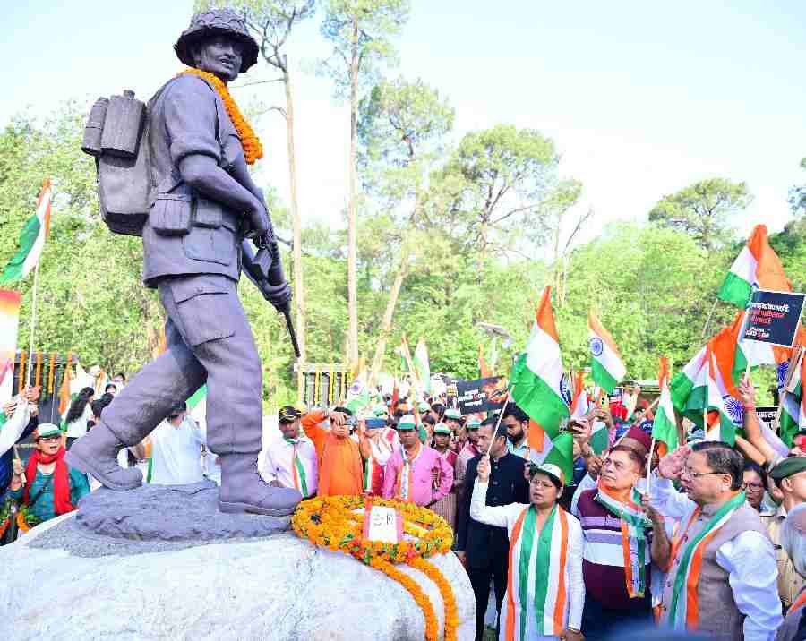 मुख्यमंत्री पुष्कर सिंह धामी के नेतृत्व में बुधवार को शौर्य स्थल चीड़बाग से गांधी पार्क तक भव्य “तिरंगा शौर्य सम्मान यात्रा” का आयोजन किया गया। यह यात्रा हाल ही में भारतीय सशस्त्र बलों द्वारा सफलतापूर्वक चलाए गए “ऑपरेशन सिंदूर” की ऐतिहासिक विजय को समर्पित रही। हजारों की संख्या में आमजन, पूर्व सैनिक, युवा वर्ग एवं मातृशक्ति ने तिरंगे के साथ पद यात्रा में भाग लिया। मुख्यमंत्री ने इस अवसर पर शौर्य स्थल पर पुष्प चक्र अर्पित कर शहीद जवानों को श्रद्धांजलि भी दी।